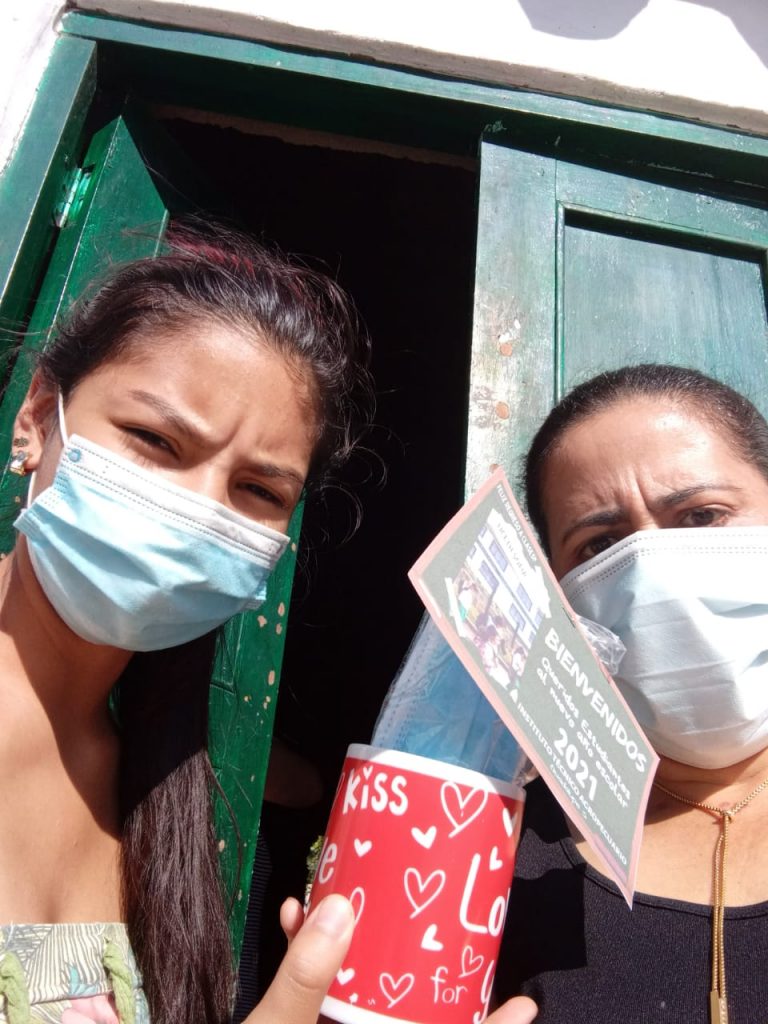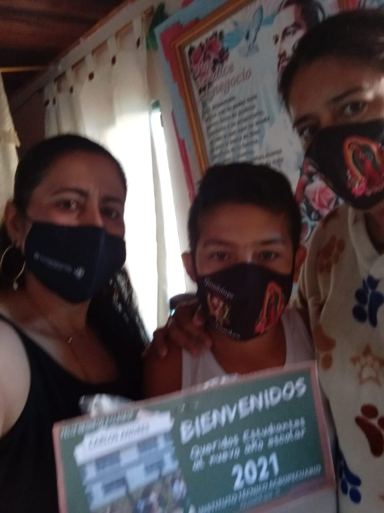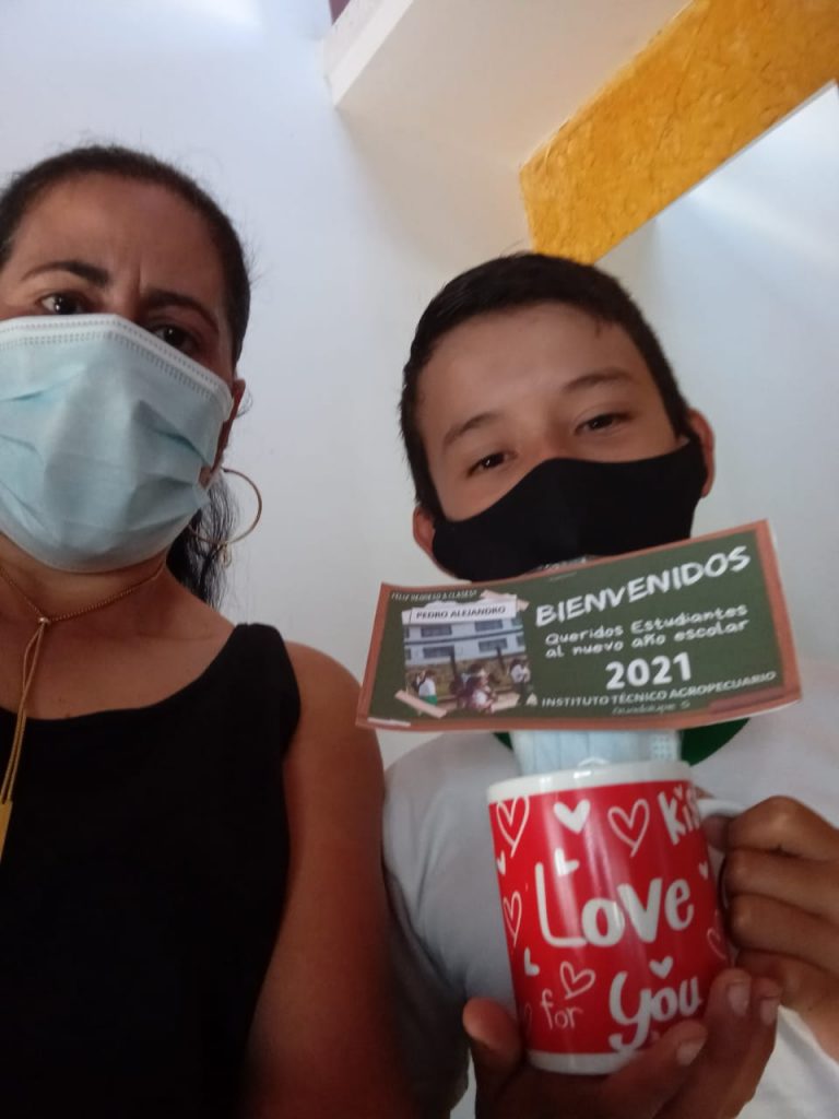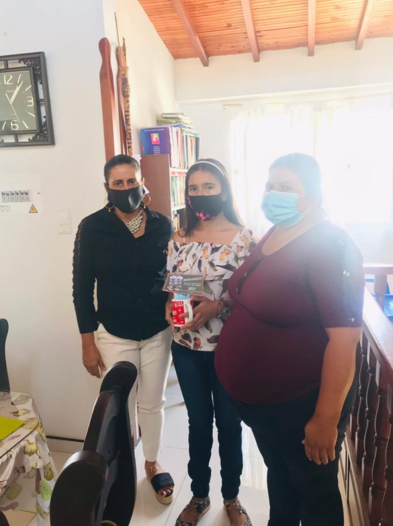 Profesora Alexandra Reyes grado séptimo visitando estudiantes y llevándoles un detalle como bienvenida