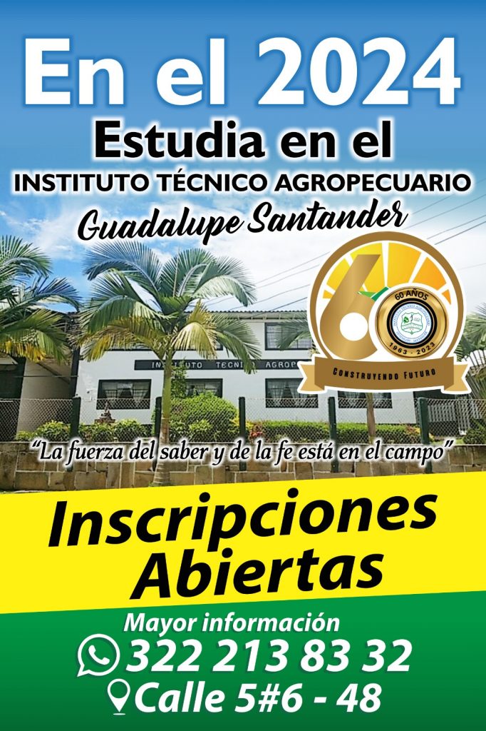 El Instituto Técnico Agropecuario ITA de Guadalupe del municipio de Guadalupe – Santander se permite informar a la comunidad en general que se encuentran abiertas las incripciones para estudiar en esta institución para el año 2024.