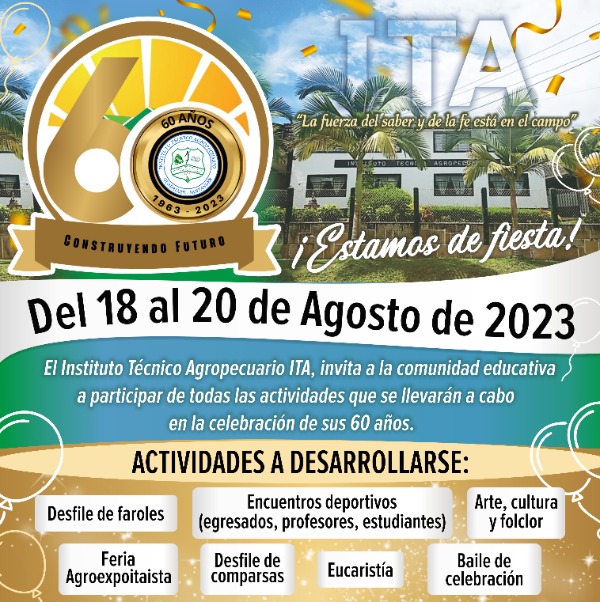 Conozca la programación que el Insituto Técnico Agropecuario ITA tiene programado en la celebración de sus 60 años; las actividades a desarrolarse son las siguientes: